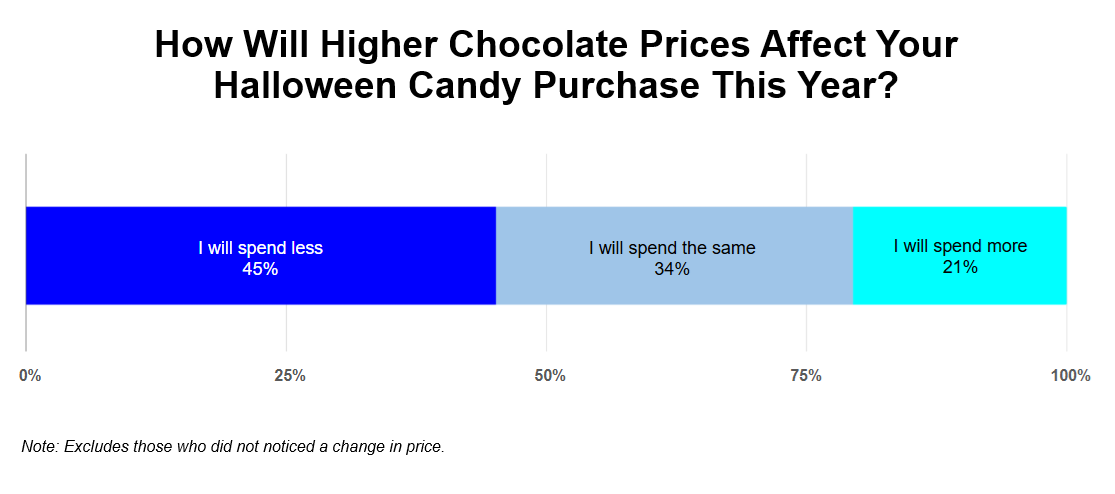- Occam asked Americans how elevated chocolate prices will impact their Halloween candy spend this year. In light of the increases, respondents are more than twice as likely to say they’ll spend less rather than more, pointing to softer chocolate consumption.