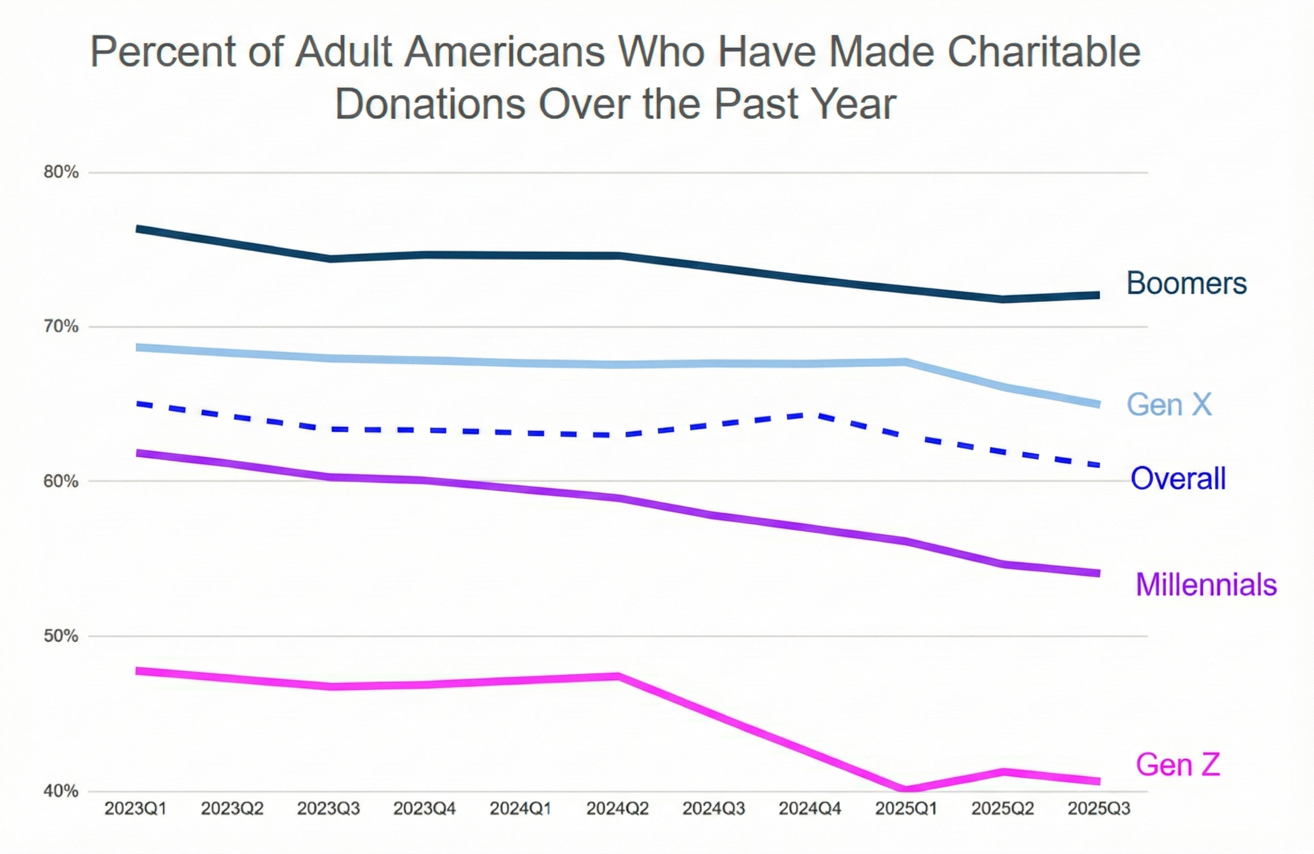 - Occam tracks trends in American charitable giving. A clear trend has emerged: across all age groups, the share of people donating to charity is declining, with the steepest drop occurring among younger generations. Rising financial pressures and higher living costs appear to be contributing factors, as donation rates have fallen across nearly every income group with the exception of the highest earners (data available upon request).