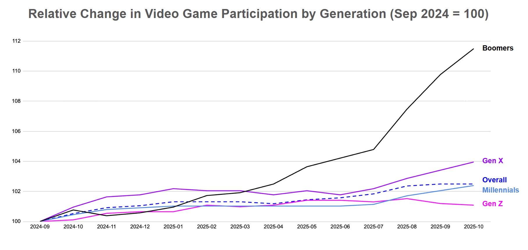 - Occam’s tracking of technology and consumer behavior trends shows a more nuanced picture. While 93% of Gen Z and 90% of Millennials report playing video games, comprising the majority of players, Boomers’ participation has risen from 52% in September 2024 to 58% in October 2025, making them the fastest-growing group in the space. Mobile gaming appears to be driving this growth, with more Boomers reporting that they use smartphones to play video games (data available upon request).
