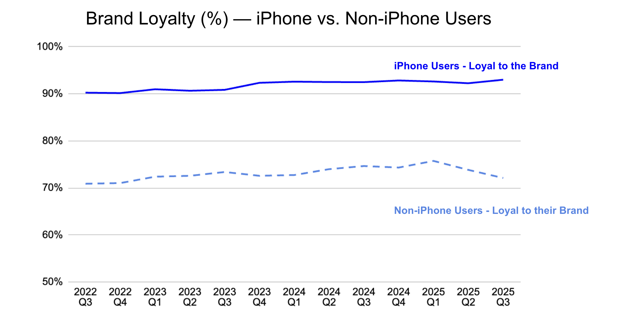 - Occam’s consumer behavior tracking shows that iPhone user brand loyalty has been meaningfully higher than that of other smartphone brands for the past three years and continues to rise. This strength persists despite Apple’s comparatively muted AI rollout, suggesting users are not upgrading solely for generative AI features but for more practical improvements such as battery life and camera performance (data available upon request). In short, Apple does not need to win the AI spending war to win the customer, as loyalty compounds and restraint in capital expenditure has become a strategic advantage rather than a liability.